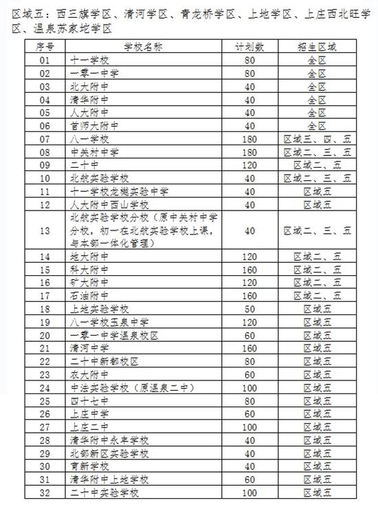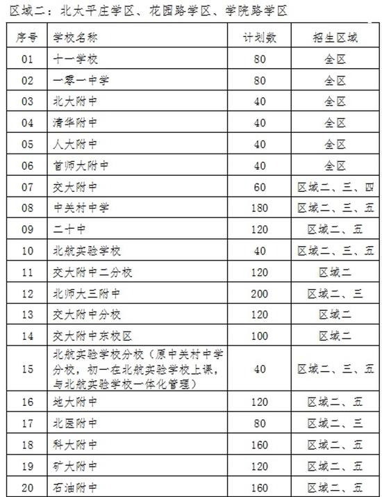 二、海淀区依据全区各小学和一般公办初中的数量、地理位置,在17个学区的基础上,进行统筹整合,划分成五大招生区域,使每个区域从初中数量、登记学位两方面都达到基本均衡。