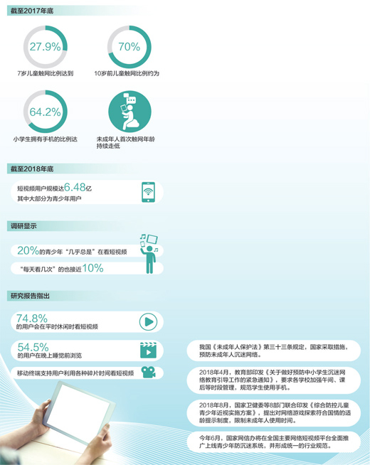 此外,还要规范短视频行业发展,遏制其野蛮生长。“有些短视频平台利用大数据算法,有针对性地投放容易引发青少年过度依赖的内容,对此应坚决整治。”田丰认为,短视频平台应当引导未成年人看到更多、更好的内容,增益身心健康。