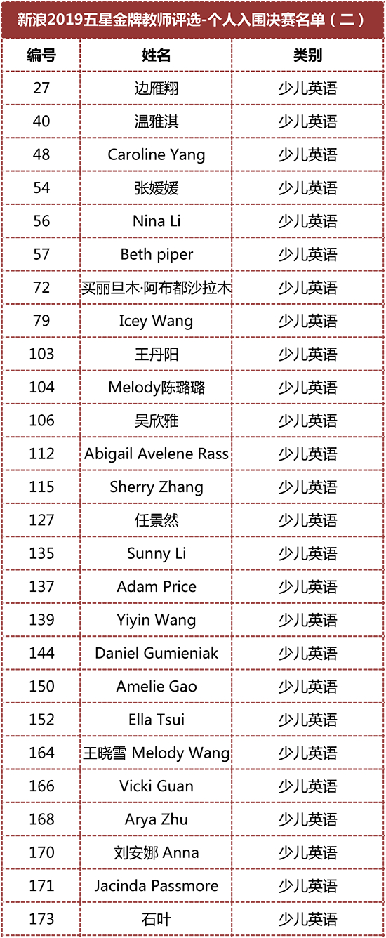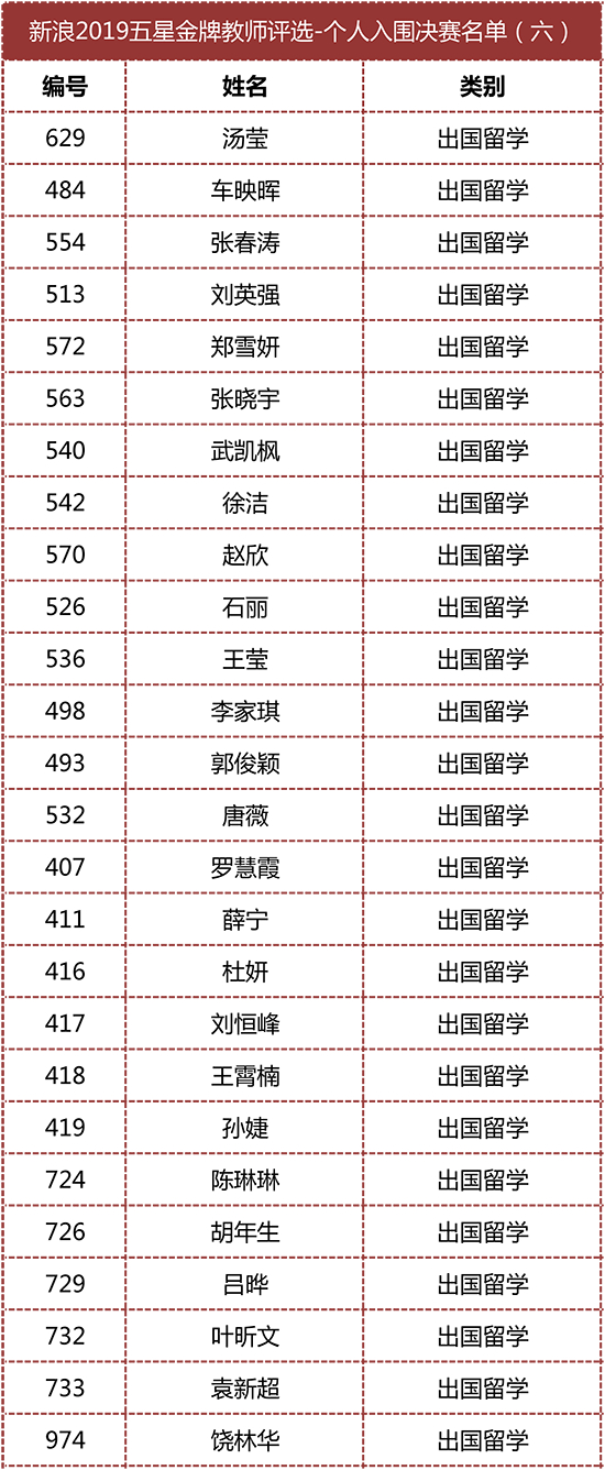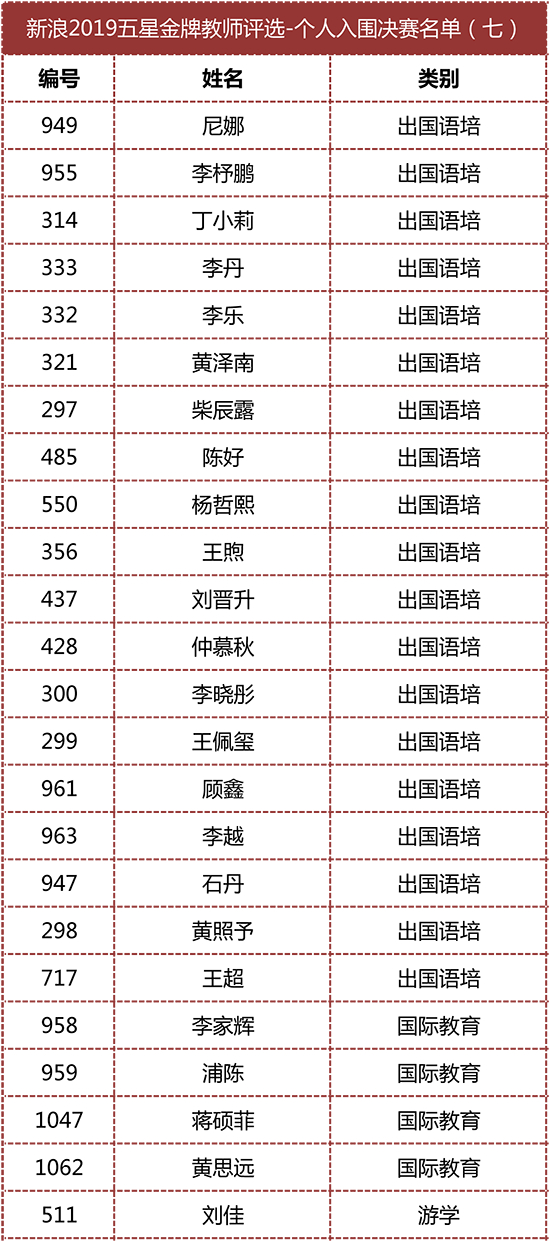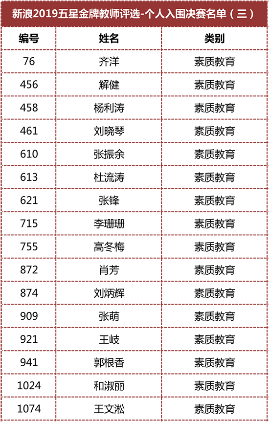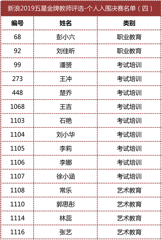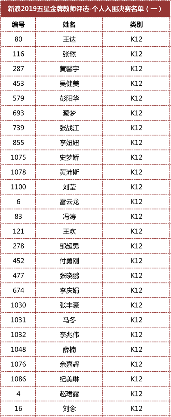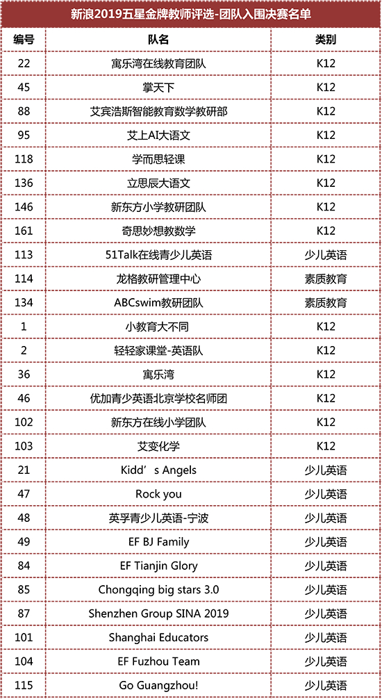 新浪教育讯 8月20日,“新浪2019五星金牌教师评选”入围决赛的团队及个人公布。具体如下: