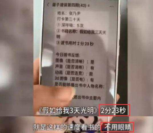 量子波动速读微信群里的家长们,已经开始积极反馈自己上小学二年级的女儿“2分23秒读完《假如给我三天光明》”的学习成果了。