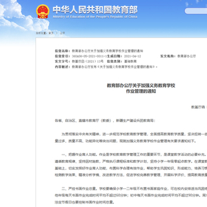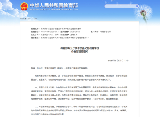 4月25日,在教育部官网,教育部办公厅发布《关于加强义务教育学校作业管理的通知》。通知中提到,学校严禁给家长布置或变相布置作业,严禁要求家长批改作业,学校要确保小学一二年级不布置书面家庭作业;小学其他年级每天书面作业完成时间平均不超过60分钟;初中每天书面作业完成时间平均不超过90分钟。以下为通知原文: