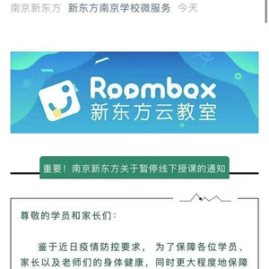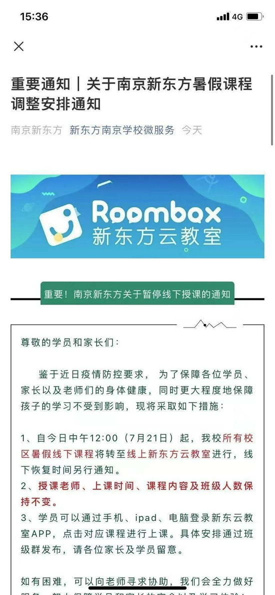 南京新东方在通知中提及:“自今日中午12:00(7月21日)起,我校所有校区暑假线下课程将转至线上新东方云教室进行,线下恢复时间另行通知。授课老师、上课时间、课程内容及班级人数保持不变。”