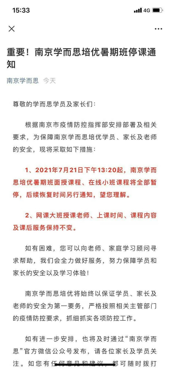 南京学而思在通知中提到:“2021年7月21日下午13:20起,南京学而思培优暑期班面授课程、在线小班课程将全部暂停,后续恢复时间另行通知。网课大班授课老师,上课时间、课程内容及课后服务保持不变。”